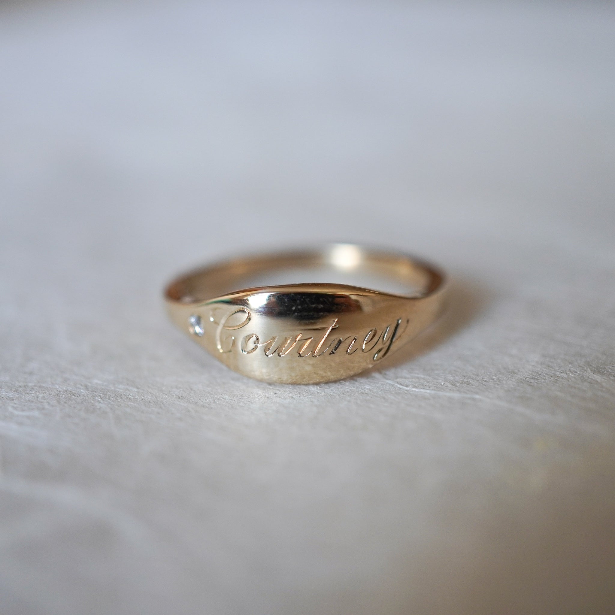 This handcrafted signet ring is a love letter to your maiden name - a way to carry it with you always, even as you say I do. Thoughtfully hand-engraved with your chosen name, it’s a piece that feels both personal and timeless.